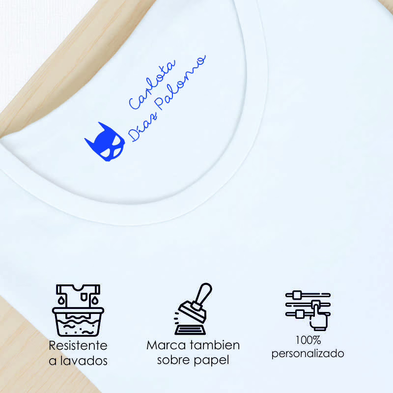 – Sello con tinta especial para marcar sobre tejidos, resistente a varios lavados. Colores disponibles en azul o negro.